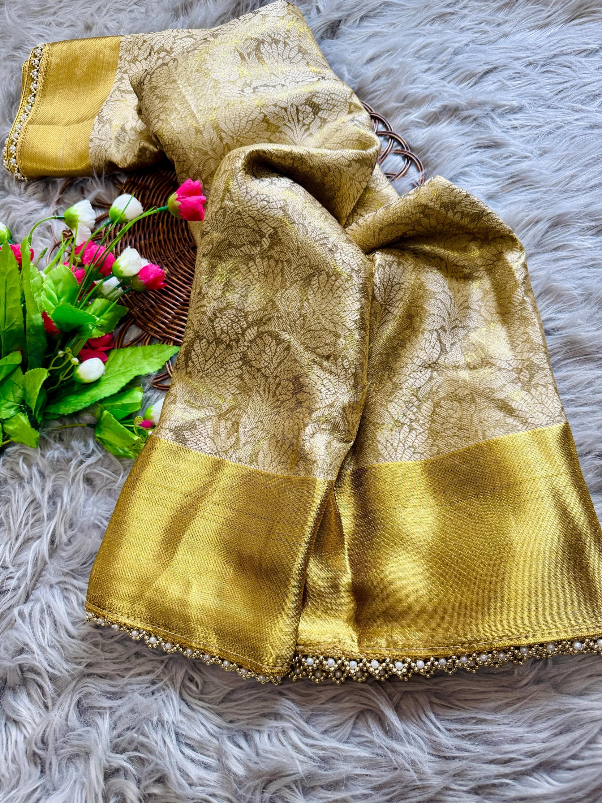 Radiate grace and opulence in our Nita Elegance Golden Tissue Silk Saree, inspired by the timeless style of Nita ji.